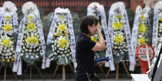 21일 오후 서울 서초구 강남서초교육지원청에 마련된 추모공간에서 한 선생님이 눈물을 보이고 있다. |