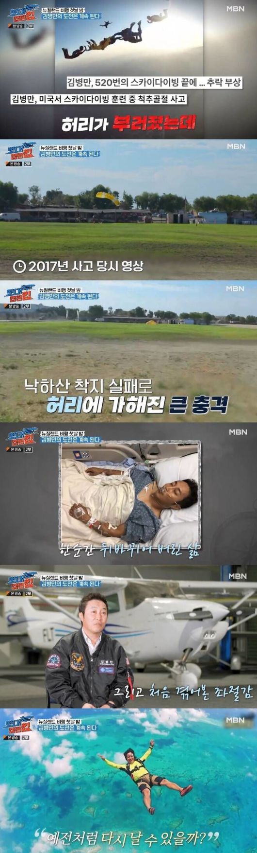 김병만은 "허리가 부러지면서 엄청난 좌절감을 느꼈다. 한순간 내 신체 능력이 50% 줄어든 느낌이었다"며 "김병만 하면 슬랩스틱 코미디, 무술 코미디인데 다시 움직일 수 있을지 좌절했다. 전처럼 활동할 수 없게 되자 비행을 꿈꾸게 됐다"고 설명했다. 이날 방송에선 김병만이 부상당하던 순간 영상도 공개됐다. 낙하산을 타고 내려오던 김병만은 제대로 착지를 하지 못하고 그대로 땅에 곤두박질 친다.