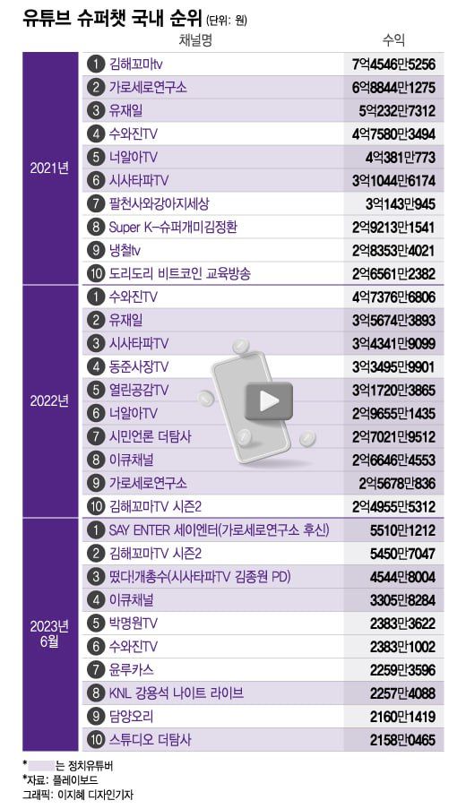한편 플레이보드에 따르면 지난해 국내 유튜브 슈퍼챗 수입 상위 10위권 △수와진TV △유재일 △시사타파TV △동준사장tv △열린공감TV △너알아TV △시민언론 더탐사 △이큐채널 △가로세로연구소 △김해꼬마TV 시즌2 가운데 7개 채널이 정치 유튜브였다.
