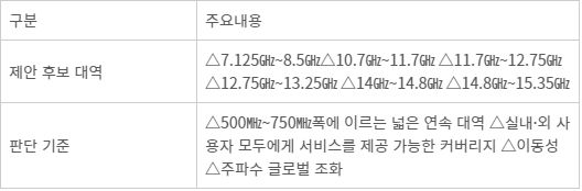 GSA는 이같은 가능성을 충족하는 주파수로 △7.125㎓~8.5㎓△10.7㎓~11.7㎓ △11.7㎓~12.75㎓ △12.75㎓~13.25㎓ △14㎓~14.8㎓ △14.8㎓~15.35㎓ 총 6개 대역을 후보로 제안했다.