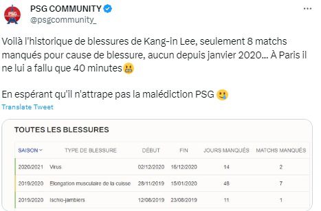 PSG 팬 계정인 'PSG 커뮤니티'는 "이강인의 부상 이력을 살펴보면, 지금까지 부상으로 결장한 경기는 8경기뿐"이라며 "특히 2020년 1월 이후엔 단 한 경기도 부상으로 인해 결장하지 않았다"라고 설명했다.