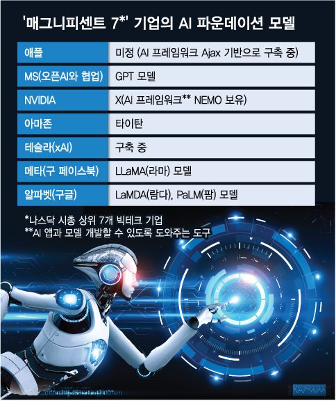 이번 애플의 합류로 '매그니피센트 7(△애플 △MS △NVIDIA(엔비디아) △아마존 △테슬라(테슬라 CEO인 일론 머스크의 xAI) △메타 △알파벳(구글 모기업))'이라 불리는 나스닥 시총 상위 7개 빅테크 기업이 모두 생성형 AI 경쟁에 나섰다.