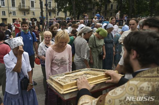 [오데사=AP/뉴시스] 23일(현지시각) 러시아의 미사일 공격으로 파괴된 우크라이나 오데사의 축일 대성당 앞에서 신자들이 미사를 올리고 있다. 러시아의 오데사 공격이 이어지며 지금까지 1명이 숨지고 22명이 부상했으며 유네스코 세계문화유산인 축일 대성당도 파괴됐다. 2023.07.24.