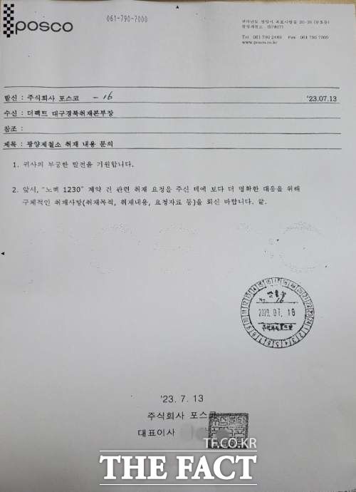 반면 광양제철소관계자는 "구체적으로 취재목적, 취재 내용, 요청자료 등을 회신해달라"는 공문을 <더팩트>에 보냈다. 한번 더 계약사실 여부를 요청하자 문자로 똑같이 답했다.