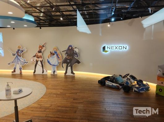 벽면 한켠에는 '메이플스토리M' 포스터와 함께 던전앤파이터 포스터도 자리하고 있다. 역시 넥슨하면 카트, 던파, 메이플이다. 본사 출입문 앞에 안내 키오스크에도 메이플스토리 버섯이 등장해 방문객을 안내해준다.