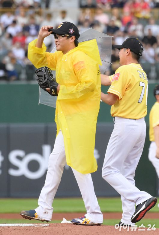 2023 KBO리그 올스타전이 15일 오후 부산 사직야구장에서 열린 가운데 1회말 드림 올스타 선발 박세웅(롯데)이 마운드에 오르고 있다. 박세웅은 '레인맨'이라는 별명 답게 나서는 경기 우천취소 19회, 강우콜드 1회, 우천노게임 1회, 우천서스펜디드 1회, 우천지연 3회를 기록하고 있다. [사진=정소희 기자] |
