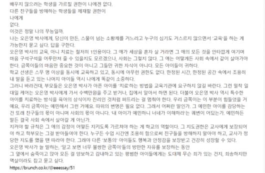 A씨는 끝으로 “나는 오은영 박사에게, 당신이 만든, 스물이 넘는 소황제를 거느리고 누구의 심기도 거스르지 않으면서 '교육'을 하는 게 가능한지 묻고 싶다”고 하며 “지켜야 할 규칙은 그 애의 감정이 어떻든 지키도록 가르쳐야 하는 게 학교의 역할이다. 그 지도권한은 교사에게 보장되어야 하고 학부모는 그걸 받아들여야 한다”고 말했다.