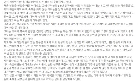 글쓴이 A씨는 “교직 경력이 10년을 바라보는데 나는 점점 더 무능해지고 있다”며 말문을 열었다. 그는 “어느샌가부터 오은영 박사의 말들이 '육아의 바이블'이 되면서 모든 아이는 무조건적으로 이해받아야 하고 사랑받아야 하는 존재가 됐다”고 말하며 “오 박사는 아이의 행복과 안정감, 건강한 성장을 방해하는 모든 것이 학대라고 말한다. 진의가 그렇지 않을 수도 있겠으나 학부모들은 저 말을 텍스트 그대로 받아들였고 그 결과 학교는 아동학대의 온상이 되었다. 어떻게 한 전문가의 의견을 종교처럼 맹신하는지. 신기하다”고 했다.