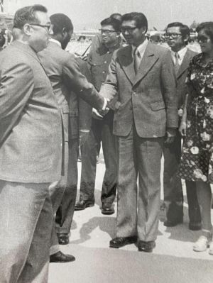 북한과 몽골 순방을 위해 1978년 6월 14일 북한 평양국제공항에 도착한 사모라 마셀(왼쪽 두번째) 모잠비크 대통령이 마중나온 주북몽골대사와 악수하고 있다. 오른쪽 두 번째 안경 쓴 사람이 바산자브 락바 몽골 전 NSC 고문이다. 맨 왼쪽에 북한 김일성 주석이 보인다. 바산자브 락바 제공 |