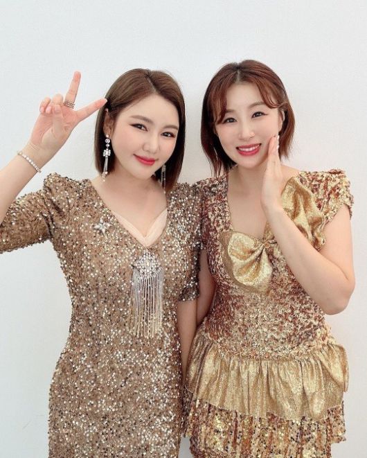 공개된 사진 속에는 송가인이 동료인 가수 이미리와 나란히 포즈를 취하는 모습이 담겼다. 송가인은 날씬한 자태로 드레스를 소화하며 단아하고 청순한 아우라를 뽐내 눈길을 모았다.