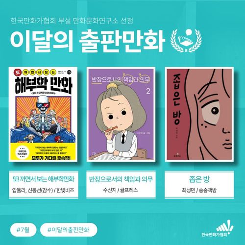 (서울=연합뉴스) 김경윤 기자 = 한국만화가협회 부설 만화문화연구소는 26일 7월 이달의 출판만화로 '또! 까면서 보는 해부학 만화', '반장으로서의 책임과 의무', '좁은 방'을 선정했다.