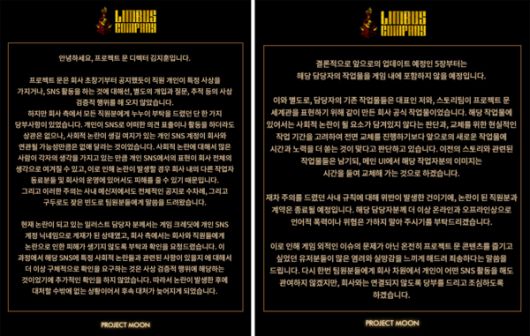 프로젝트문은 26일 '림버스 컴퍼니'의 공지사항을 통해 김지훈 대표가 작성한 입장문을 공개했다. 림버스 컴퍼니는 최근 캐릭터 잠수함 하항 패치 스킬 발동 조건 표기 오류 인게임 핵 사용 및 보안 문제 일러스트레이터의 과거 SNS 활동 등으로 다양한 논란에 휘말렸다.