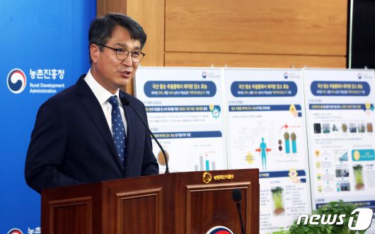 (세종=뉴스1) 김기남 기자 = 서효원 농촌진흥청 국립식량과학원장이 26일 오전 세종시 정부세종청사 농식품부에서 국산 품종 팥순으로 키운 팥순 추출물이 체지방과 체중 감소에 탁월한 효과를 확인한 연구 결과에 대해 발표하고 있다. 국립식량과학원은 전북대학교와 공동연구를 통해 팥순 추출물이 체지방 감소에 따른 비만 개선에 큰 효과가 있으며, 그 핵심 유효성분이 아주키사포닌 Ⅱ임을 최초 확인했다고 밝혔다. 2023.7.26/뉴스1