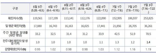 26일 중앙방역대책본부에 따르면 7월 셋째 주(7월 16∼22일) 코로나19 확진자는 25만3천825명으로, 전주 대비 35.8% 증가했다.