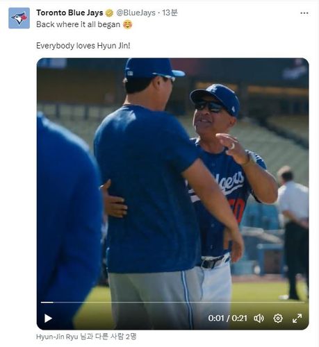 미국프로야구 메이저리그(MLB) 토론토 블루제이스 구단은 26일(한국시간) 소셜미디어를 통해 로스앤젤레스 다저스 선수단을 만난 류현진의 모습을 소개했다.