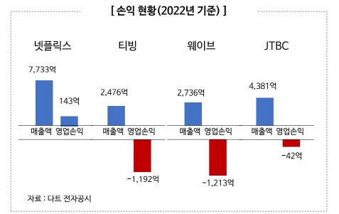 26일 미디어미래연구소와 변재일 더불어민주당 의원, 김영식 국민의힘 의원이 개최한 ‘글로벌 스탠다드에 적합한 콘텐츠 투자재원 관련 제도개선 방안 포럼’에선 넷플릭스ㆍ디즈니+ 등 글로벌 OTT 공략 속에서 국내 콘텐츠 시장 생태계를 살리기 위한 대안들이 제시됐다. 실제 지난해 티빙은 1192억원 영업손실, 웨이브 1213억원 영업손실, JTBC도 42억원 영업손실을 기록한 반면, 넷플릭스는 143억원의 흑자를 냈다.