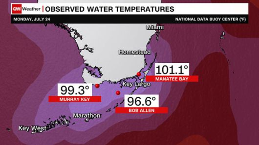 방송은 "사우스 플로리다와 키 라르고 사이인 매너티 베이에 있는 부표가 24일(월) 밤 약 3시간 동안 세 자리 수의 온도(화씨 기준)를 기록했다"며 "NOAA(미 해양 대기청)에 따르면 부표는 이날 오후 화씨 100도를 기록했고 한 시간 후 화씨 101.1도(섭씨 약 38.4도)에서 최고점을 찍은 후 오후 8시까지 이 사이의 온도를 유지했다"고 전했다.