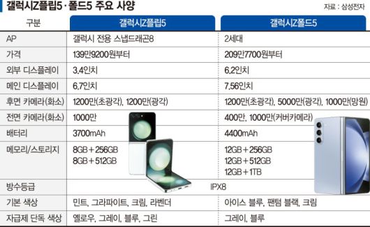 갤럭시Z5를 공개한 삼성전자는 국내에서 내달 1~7일 사전예약을 진행하고, 11일 신제품을 공식 출시한다. 출고가는 전작 대비 소폭 올랐다. 갤럭시Z플립5는 5만원가량 상승한 139만9200원부터, 갤럭시Z폴드5는 약 10만원 높아진 209만7700원부터다. 이 외에 신규 액세서리도 함께 출시한다.