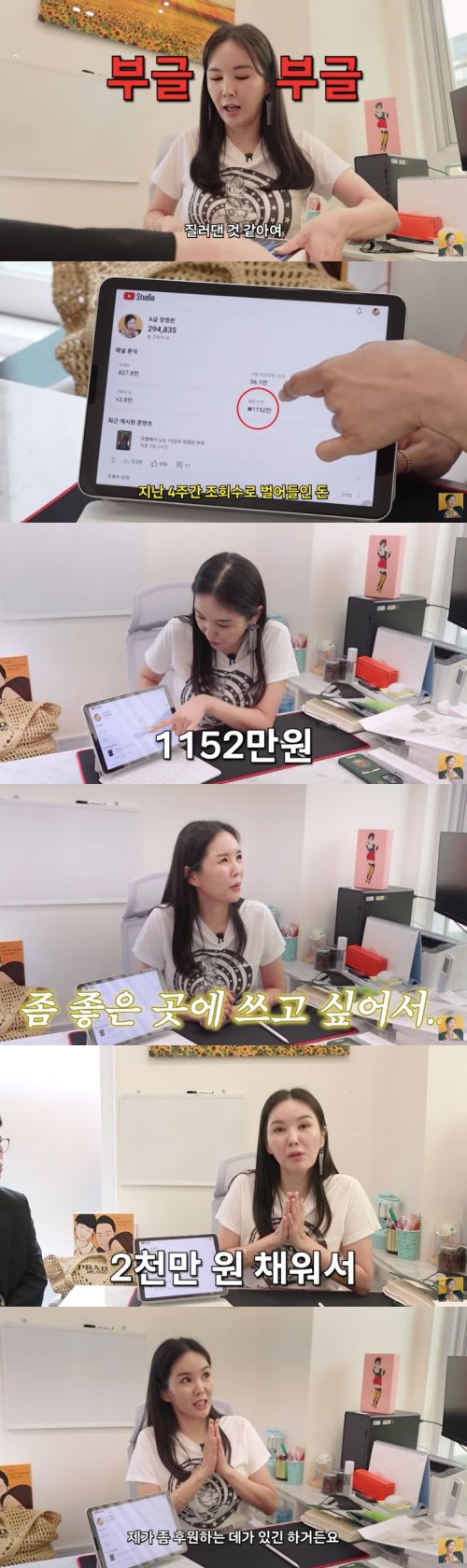 태블릿 PC로 자신의 유튜브 채널에 접속한 장영란은 지난 4주 동안의 예상 수익을 공개했다. 장영란은 1,152만 원이라는 금액을 공개하며 “이거 다 좋은 곳에 쓰고 싶다. 돈을 더해서 2천만 원 채워서 (하겠다). 남자아이들 보육원이다”라고 수익금을 기부할 것이라고 밝혔다.
