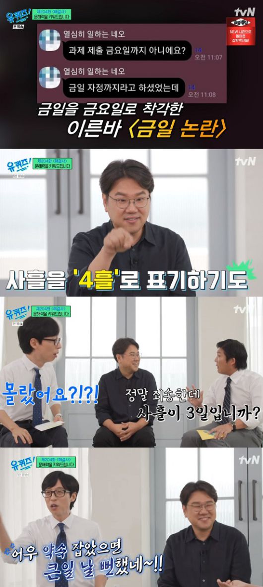 이날 방송에서 유재석은 "문해력이 떨어진다는 기사들이 많이 나기도 하고. 대학교 단체 톡방에는 금일을 금요일로 착각하는 일도 있었다"고 말했다.