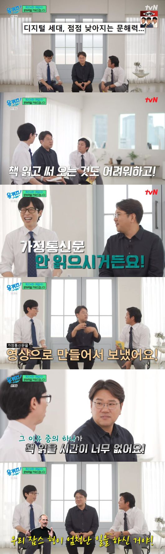 유재석은 "잡스형이 엄청난 일을 하신 거다. 스마트폰 하나로 엄청 많이 바뀌었다. 긴 영상도 안보니까"라며 "요즘 유튜브에 고려사 20분 요약, 세계사 10분 요약이 있다"고 말했다.