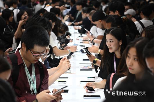 국내 첫 삼성전자 갤럭시 언팩 행사가 26일 서울 강남구 코엑스에서 열렸다. 참석자들이 갤럭시 Z 폴드5, 갤럭시 Z 플립5 등 신제품을 체험하고 있다.