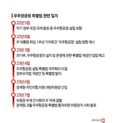 지난 23일 국회 과학기술정보통신위원장 장제원 국민의힘 의원이 자신의 페이스북에 올린 '조건부 사퇴' 배수진으로 인해 우주항공청에 대한 관심이 뜨겁다. 우주항공청 설립은 윤석열 정부 국정 과제이면서 과학기술정보통신부의 핵심 추진 사업이다. 정부는 지난 4월 우주항공청 설치 및 운영에 관한 특별법을 국회에 제출했다.