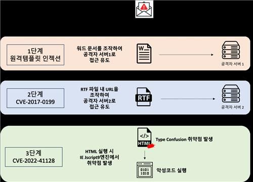 MS워드 등 악성 문서 파일을 열람할 때 사용자 PC가 공격자 서버로 접속돼 악성 서식 파일(RTF)을 내려받고, 이후 악성 서식 파일에 들어간 인터넷주소(URL)를 통해 공격자 서버에서 악성 HTML 파일을 추가로 내려받는 방식이다.