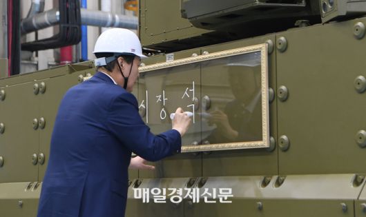 윤석열 대통령이 24일 경남 창원 한화에어로스페이스를 방문, 레드백 장갑차에 사인하는 세리머니를 하고 있다. 2022.11.24. 대통령실사진기자단 이승환기자 |