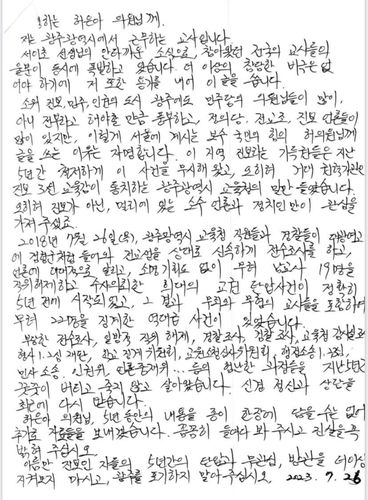 그는 "해당 교사가 대법 행정소송에서 승소하고, 급여 반환을 위한 민사 소송에서도 승소했다"며 "문제는 학생들의 일방적 진술만으로 교사가 범죄자처럼 취급받을 때 교육 당국 누구 하나 나선 이가 없었다는 점"이라고 지적했다.