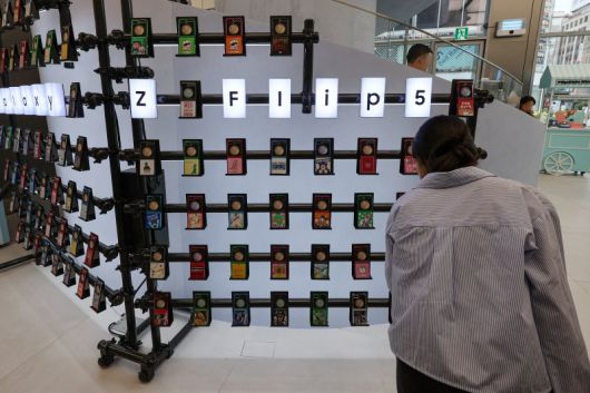 갤럭시 Z플립5·Z폴드5 신제품 27일 서울 서초구 삼성 강남을 찾은 시민들이 갤럭시 Z플립5과 Z폴드5 등 신제품을 살피고 있다. 삼성전자는 전날 밤 코엑스에서 '갤럭시 언팩'을 열고 갤럭시 Z플립5·폴드5, 태블릿PC 갤럭시 탭 S9, 스마트워치 갤럭시워치6 등 신제품을 공개했다. 연합뉴스 |