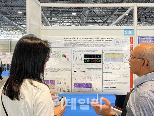 지난달 오스트리아 빈에서 개최된 EASL 유럽 간학회에서 에이프릴바이오가 ‘APB-R3’에 대한 포스터 발표를 진행하는 모습.(제공= 에이프릴바이오) |