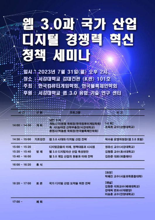 한국컴퓨터게임학회(회장 이원형)과 한국블록체인학회(회장 박용범)이 공동 주최하고 서강대학교 웹 3.0 융합 기술 연구 센터가 후원하는 <웹 3.0 과 국가 산업 디지털 경쟁력 혁신 정책 세미나>가 오는 31일 서강대학교 김대건관에서 개최된다.