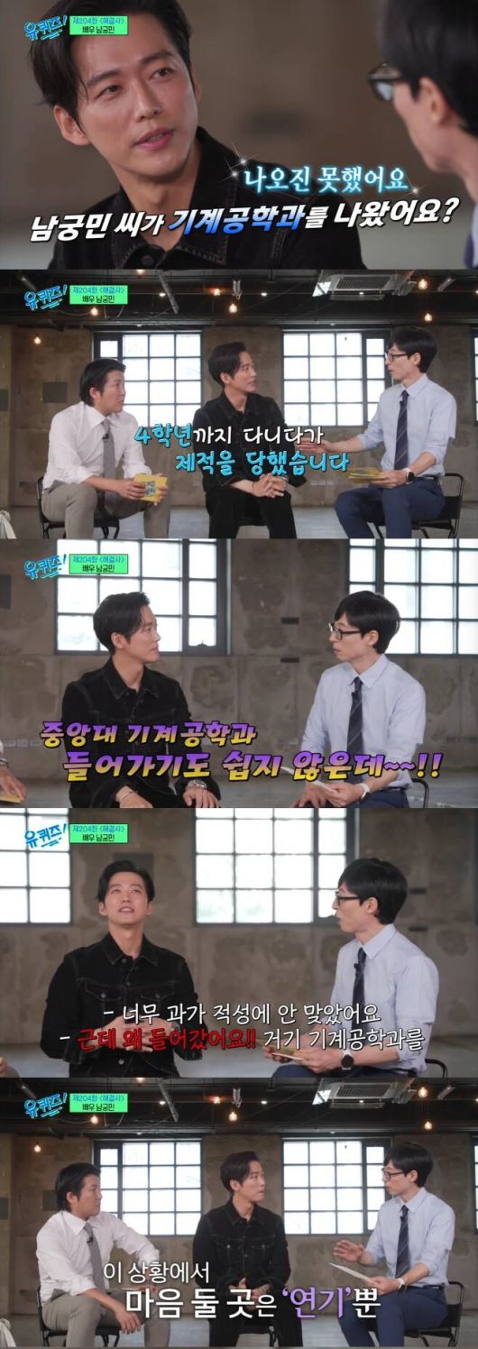 지난 26일 방송한 tvN ‘유 퀴즈 온 더 블럭’에서 남궁민은 "4학년까지 다니다가 제적을 당했다. 과가 적성에 안 맞았다"라고 밝혔다.