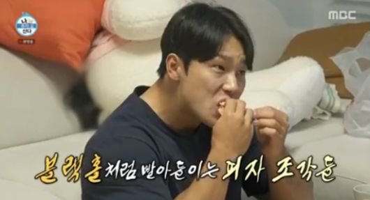 윤성빈은 도넛에 이어 아이스크림 한 통까지 먹고 분리수거, 집안 청소를 했다. 그때 피자 한 판이 도착했다. 윤성빈은 일요일 저녁은 치킨이나 피자를 먹는 편이라고 했다. 윤성빈은 피자에 곁들여 먹을 음료로 알로에 주스를 꺼내왔다. 기안84는 "지금까지 한 5천 칼로리 먹은 것 같다. 많이 먹는 게 멋있다"고 했다.