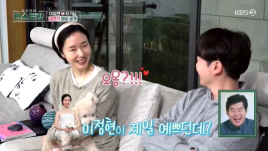 이정현은 "그때 예쁜 사람들이 진짜 많이 왔는데 누가 제일 예뻤어?"라고 물었고, 이정현 남편은 "난 다 눈에 안 들어오던데, 이정현이 제일 예뻤다"고 답해 사랑꾼 면모를 드러냈다.
