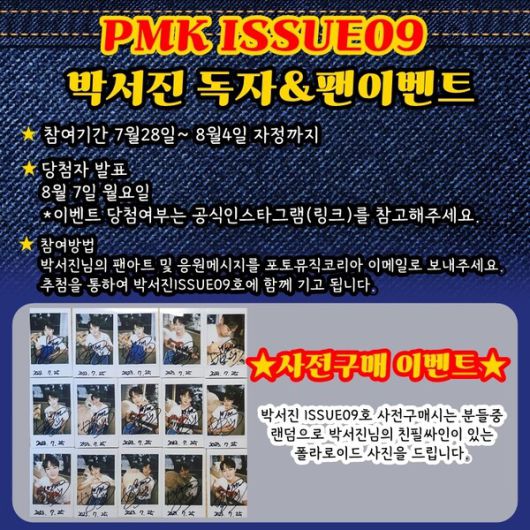 이벤트 참여 방법은 간단하다. PMK 몰에서 박서진이 커버한 잡지 사전 예약구매 시 추첨을 통해 랜덤으로 박서진의 친필싸인이 담긴 폴라로이드 사진을 증정한다고 밝혔다.