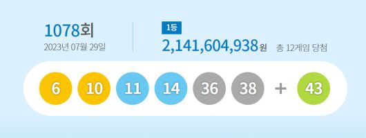 29일 동행복권에 따르면 로또 1등 번호는 ‘6, 10, 11, 14, 36, 38’이 뽑혔다. 보너스 번호는 ‘43’이다.