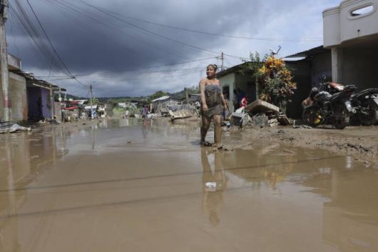 [에스메랄다스=AP/뉴시스] 5일(현지시각) 에콰도르 에스메랄다스에 홍수가 발생한 후 흙탕물 투성이의 한 주민이 침수된 도로를 걷고 있다. 에스메랄다스주에 12시간 동안 이어진 폭우로 6개의 강이 범람하고 500여 주민이 대피했다. 지금까지 사망자나 실종자에 대한 보고는 없는 것으로 알려졌다. 2023.06.06. |