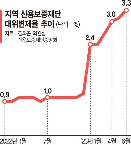 지역신보 중앙회 관계자는 "대위변제의 전 단계로 보증기관에 채무를 대신 갚아줄 것을 청구하는 보증부실률(사고율)이 지난해 1~2%에서 올해 5% 넘게 오르고 있는 만큼 하반기로 갈수록 대위변제율은 계속 올라갈 것"이라고 우려했다.