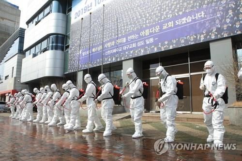 지난 2020년 3월 1일 대구시 남구 신천지대구교회 앞에서 제2작전사령부 장병 50여명이 코로나19 확산 방지를 위해 방역·소독을 하고 있다. 연합뉴스 |