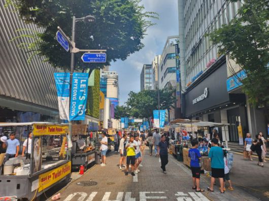 세계 최대 규모 여행 웹사이트 트립어드바이저(tripadvisor)에 따르면 명동 거리를 추천하는 외국인은 ‘볼 거리가 많다’, ‘활기가 넘친다’는 이유를 꼽았다. 반면 ‘가격이 비싸다’, ‘상품이 비슷비슷하다’는 이유로 추천하지 않는다는 의견도 있었다. 일부 리뷰에서는 “석류주스 2개를 달라고 했는데 (노점 주인은) 4개를 주문받은 것처럼 행동했다. 나는 2개라고 큰 목소리로 세 번이나 말해야 했다”며 구체적인 상황이 묘사되기도 했다.