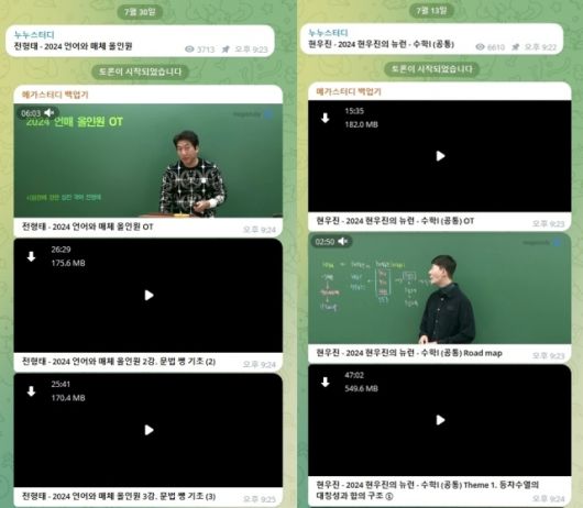 누누스터디 채널이 생성된 것은 7월10일이다. 운영자는 인원이 많아지면 영상을 더 공개하겠다는 말과 함께 메가스터디의 인기 강사 이름과 강의를 공유했다. 또 7월28일에는 입시학원 시대인재를 해킹한 증거라며 아이디와 비밀번호, 휴대전화번호 등을 텍스트로 공유하기도 했다. 샘플로 공개한 것은 500여명의 정보다.