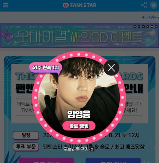 [더팩트 | 이나래 기자] 가수 임영웅이 주간 아이돌 랭킹사이트 '팬앤스타' 솔로 랭킹에서 41주 연속 1위를 차지했다.