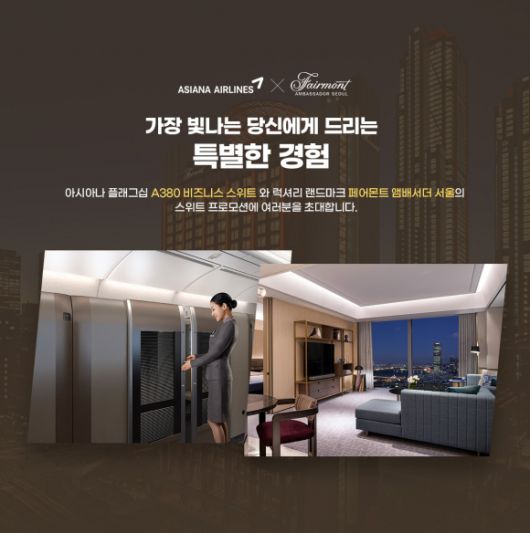 ‘아시아나 X 페어몬트 앰배서더 서울 스위트 프로모션’은 아시아나항공 홈페이지와 모바일에서 A380 비즈니스 스위트(J 클래스)를 예약한 후 해당 페이지에서 페어몬트 앰배서더 서울 예약 배너를 클릭 후 객실을 예약 했을 때 참여할 수 있다.