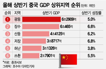 6개성의 상반기 경제성장률을 보면, 광둥성의 경제성장률이 5%로 중국 전체 경제성장률(5.5%)에 못 미쳤지만, 장수성(6.6%), 산둥성(6.2%), 저장성(6.8%)은 5.5%를 넘는 데 성공했다.