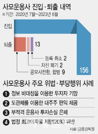 금감원은 이 같은 중대 위법 행위가 발견됐음에도 적절한 페널티가 없었다고 지적했다. 사모단 출범 이후 사모 운용사는 총 156개사가 신규 진입했지만, 중대한 불법 행위에 연루됐거나 부실 누적으로 퇴출당한 운용사는 4개사에 불과한 실정이다.