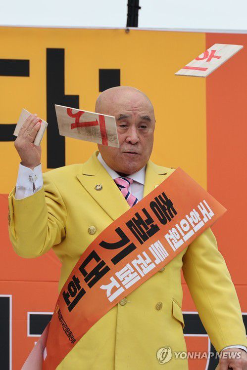 지난 7월17일 국회 앞에서 열린 국회의원 특권 폐지 촉구 집회에서 머리로 송판을 깨는 87세 원로배우 조춘 |
