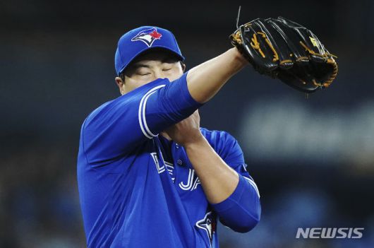 [토론토=AP/뉴시스] 토론토 블루제이스의 류현진이 1일(현지시각) 캐나다 토론토의 로저스센터에서 열린 2023 메이저리그 볼티모어 오리올스와의 경기 1회 초 투구하며 땀을 닦고 있다. 14개월 만에 복귀한 류현진은 1회에만 3피안타 2실점 하며 불안한 출발을 보였다. 2023.08.02.
