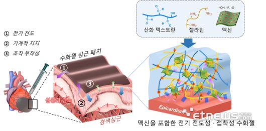 연구팀은 심장에 발라서 사용할 수 있을 뿐만 아니라 높은 전기전도성과 접착성을 갖춘 '전도성 수화젤 심근패치'를 제작했다. 이 패치는 침습 없이 안정적으로 심장의 외벽에 접착시킬 수 있고, 높은 전기전도성 덕분에 심근조직 내 전기활성도를 재생시킬 수도 있다.